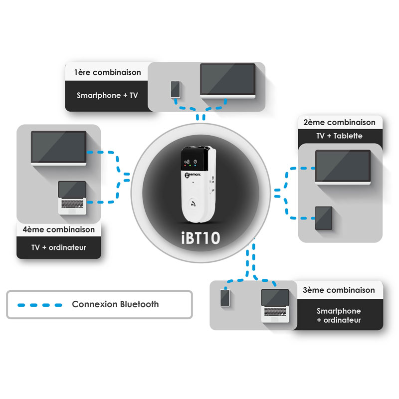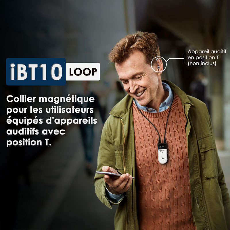 Ce boitier amplificateur audio Bluetooth permet 2 modes d’écoute différents : avec les écouteurs inclus ou avec votre appareil auditif en position T grâce au collier magnétique. Possibilité de connecter 2 appareils Bluetooth. Réglage volume jusqu’à 30dB. Réglage de la tonalité. Portée sans fil 10m. Port de chargement USB Type C TECHNIQUE. Fonctionne sur batterie 500mAH Li-poly intégré. Bluetooth version 5.0 multipoint, fonctionne avec téléphones mobiles iOS/ Android ou d’autres appareil Bluetooth (TV, PC…).Dimensions : 7,2 x 3,2 x 1,7 cm.
