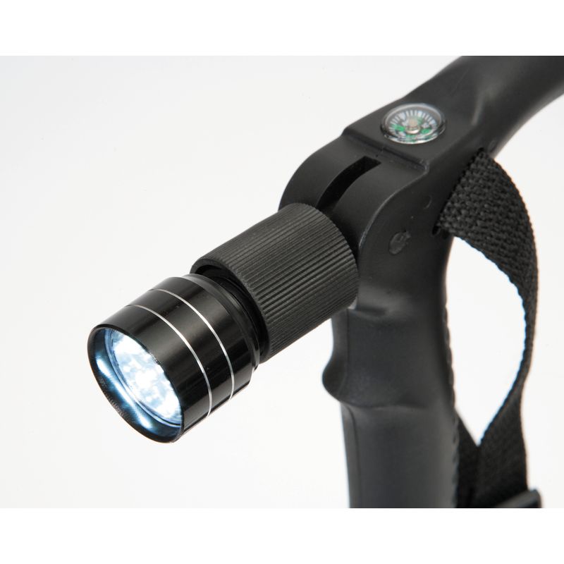 Un appui pratique et sécurisant pour vos promenades. Muni d’un embout absorbeur de chocs. Equipé d’une lumière à Led orientable. Structure aluminium légère. Poignée PVC.Réglable en hauteur de 69 à 135 cm. Coloris noir.