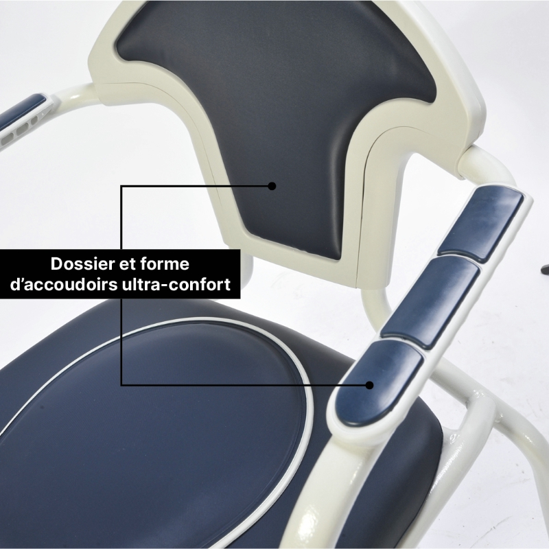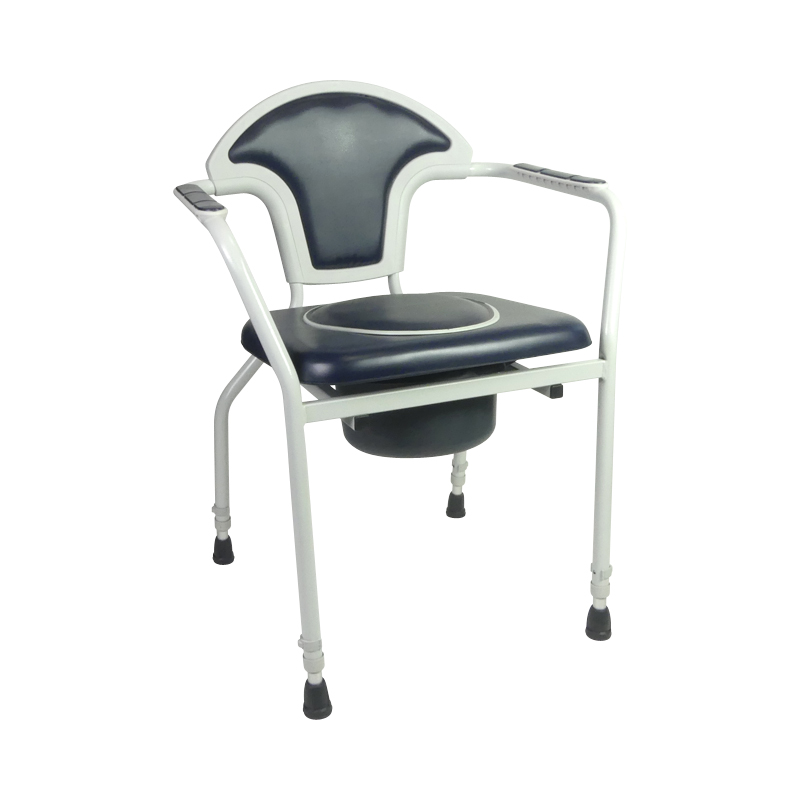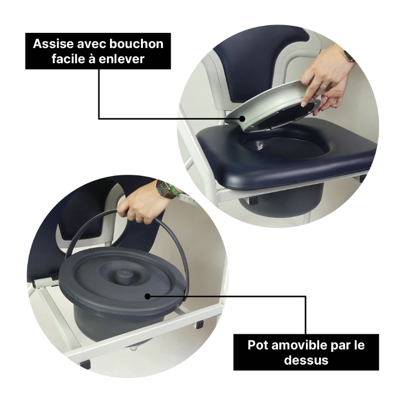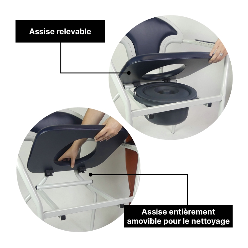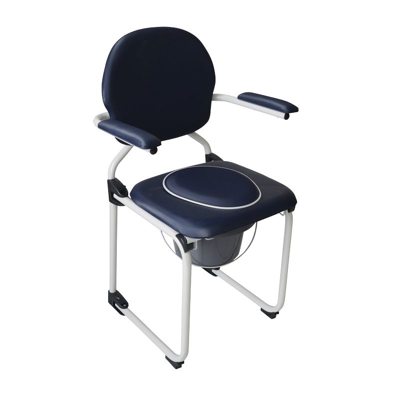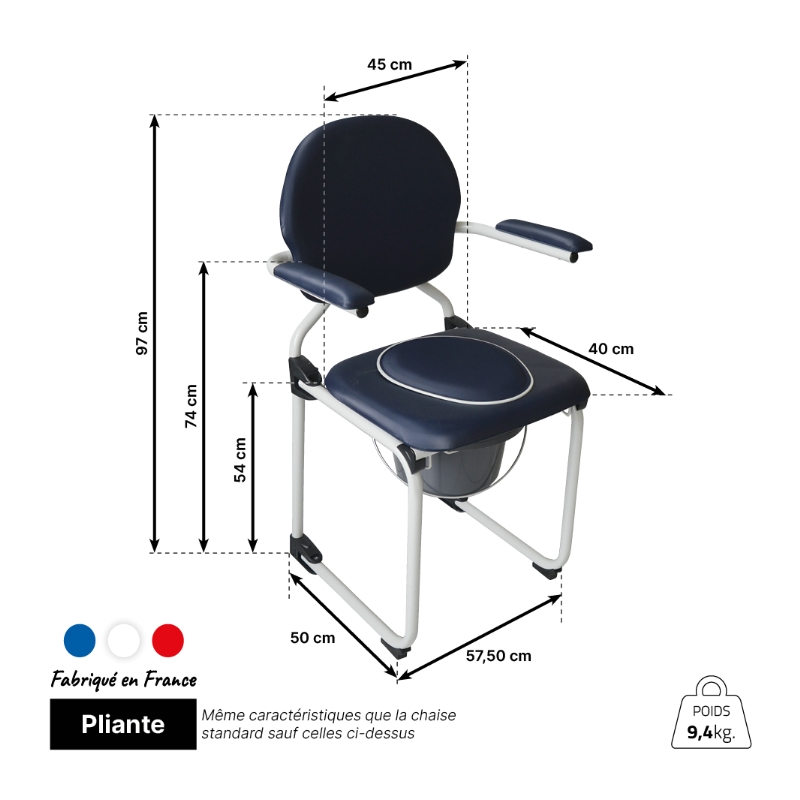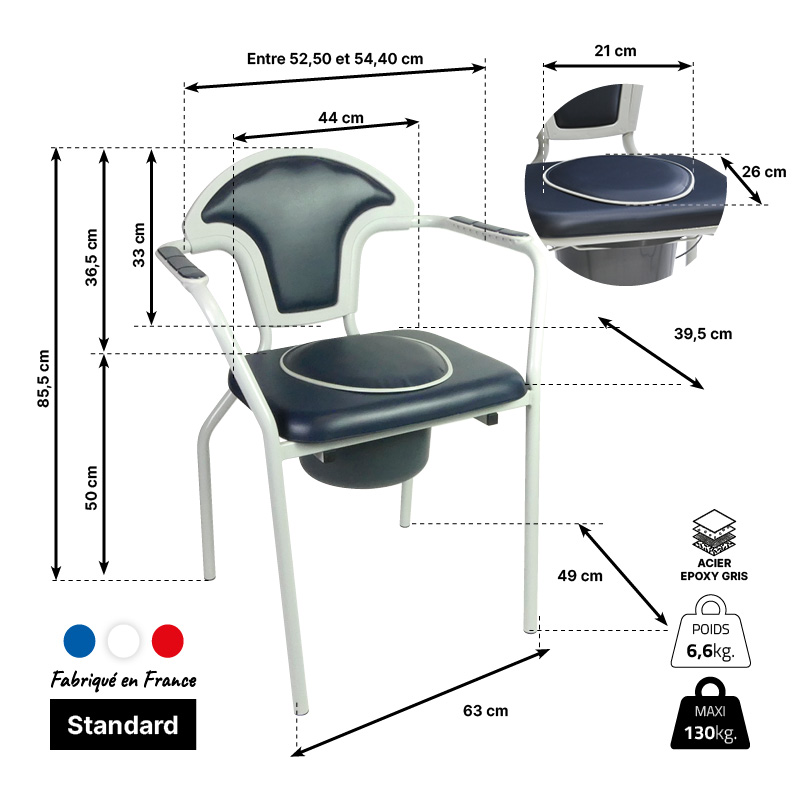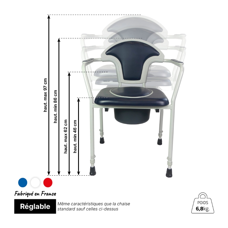 Notre chaise de toilettes Caraïbes vous garantit un très grand confort d’utilisation grâce à son assise mousse très épaisse et sa forme d’accoudoirs. Assise avec bouchon très facile à enlever tout seul. Seau amovible par le côté ou par le dessus. Assise entièrement amovible pour le nettoyage. Structure acier époxy gris et revêtement PVC imperméable. Coloris bleu marine.Modèle standard : Dimensions hors-tout: larg. 63 x prof. 49 x haut. 85,5 cmDimensions assise: larg. 44 x prof. 39,5 x haut. 50 cmLargeur entre accoudoirs : 52,5 – 54,5 cmHaut. dossier depuis l’assise : 36,5 cmHaut. dossier seul : 33 cmEvidement : prof. 26 x larg. 21 cmPoids : 6.6 kgModèle hauteur réglable :Hauteur d’assise réglable de 46 à 62 cmHauteur hors-tout : 86 à 97 cm.Poids 6.8 kg.Modèle pliante :Dimensions hors-tout : larg. 57,5 x prof. 50 x haut. 97 cm.Poids : 9,4 kg.Dimensions assise : larg. 45 x prof. 40 x haut. 54 cm.Hauteurs accoudoirs : 74 cm.Garantie 2 ans. Poids maximum utilisateur : 130 kg.