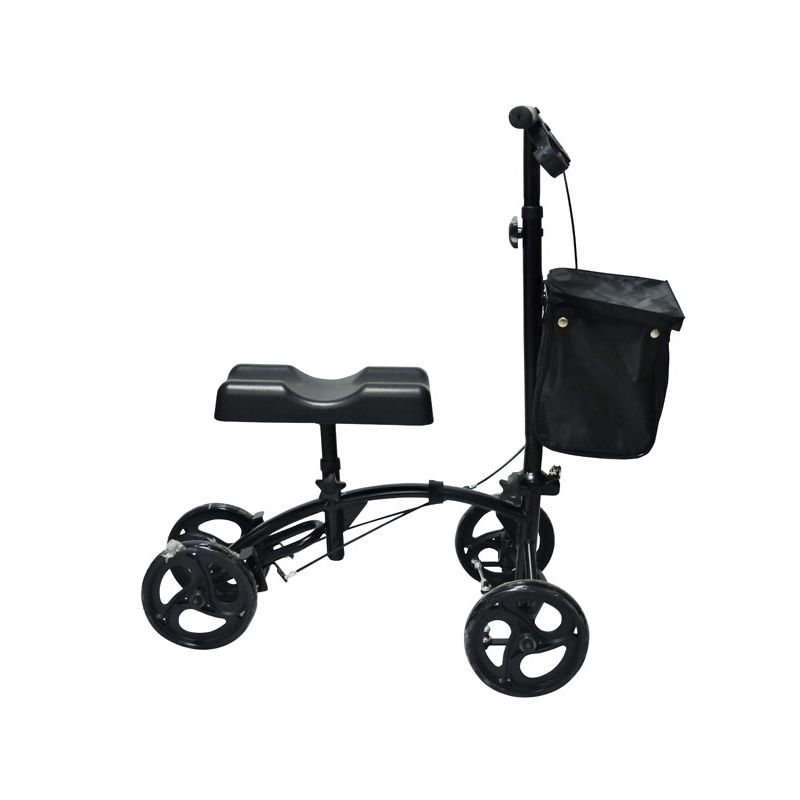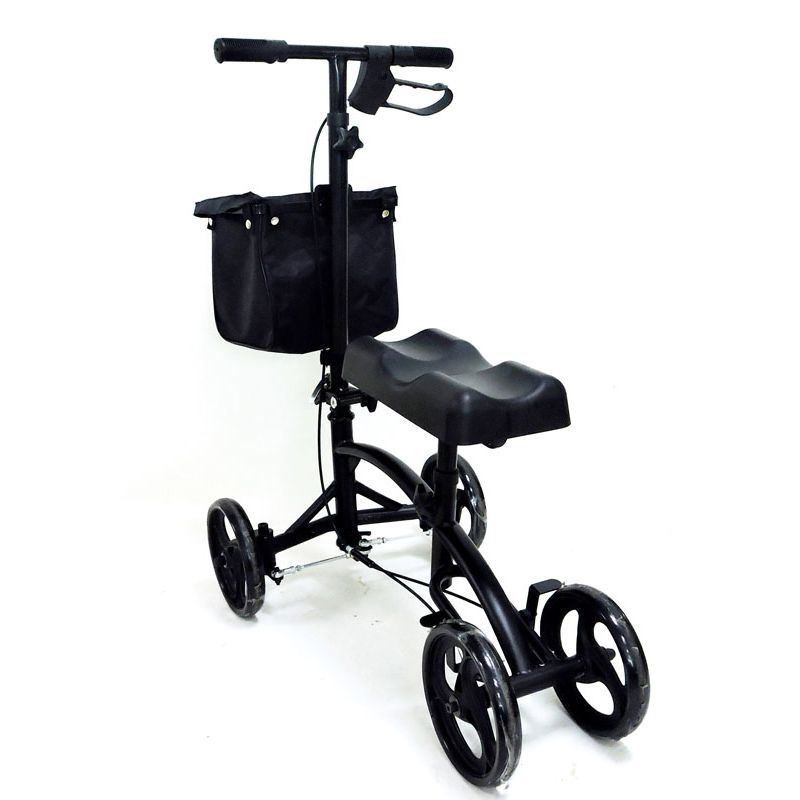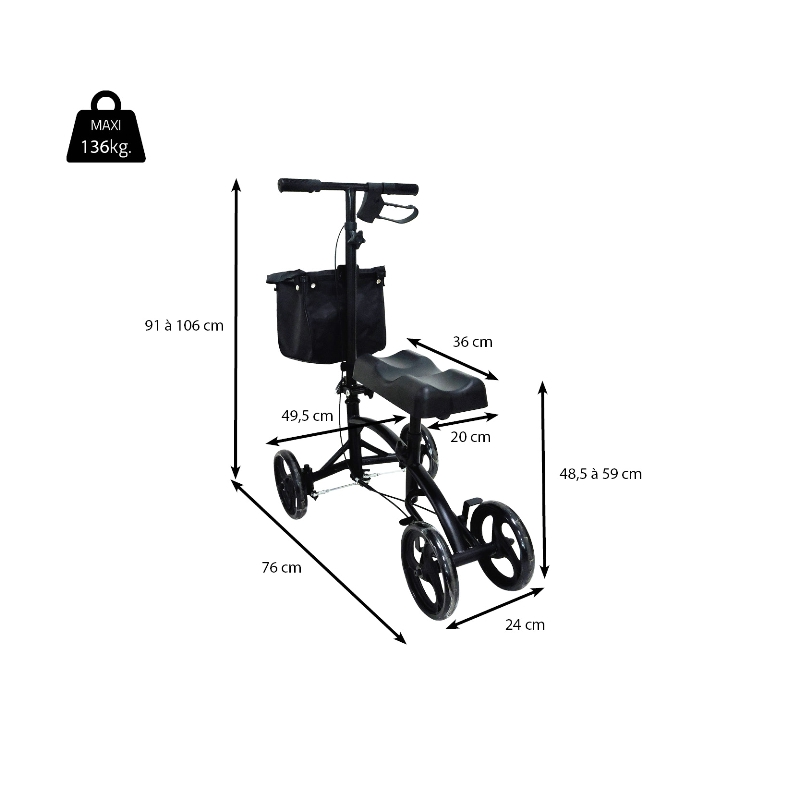 Notre déambulateur est le support idéal pour les utilisateurs ayant des soucis temporaires pour poser le pied. Il permet de marcher tout en gardant la jambe pliée confortablement. Ce déambulateur trottinette permet de vous déplacer à l’extérieur facilement et en toute sécurité. Il est muni d’un frein bloquant les 2 roues arrière simultanément. Ensemble repliable pour un rangement facilité. Frein simple et frein de parking.Structure aluminium et roues antidérapantes diamètre 20 cm.Dimensions hors-tout : larg. 49,5 (avant) et 24 (arrière) x prof. 76 x haut. 91 à 106 cm.Coussin support : larg. 20 x prof. 36 x haut 48,5 à 59 cm.Poids 10,2 kg. Poids maximum autorisé : 136 kg.