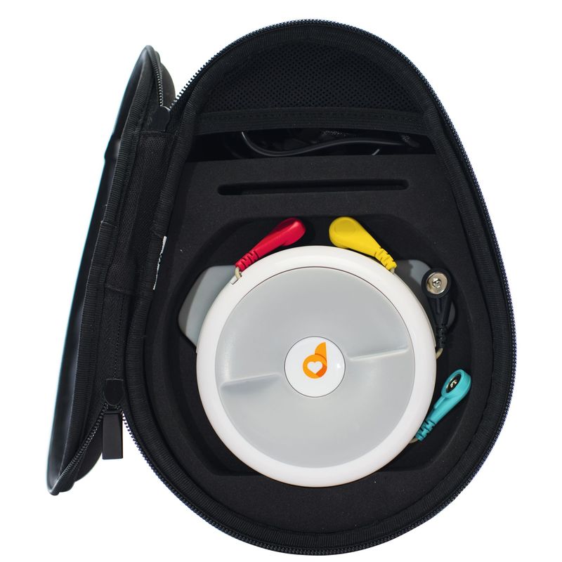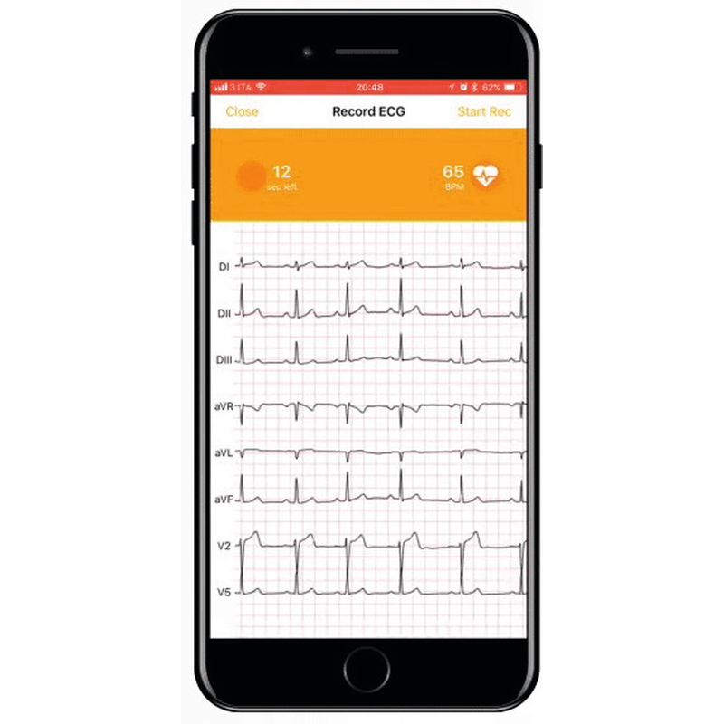 Le dispositif s’adresse aux particuliers et aux professionnels. Lors de l’inscription le type de profil sera demandé. Les particuliers pourront réaliser des ECG 8 dérivations (DI, DII, DIII, aVR, aVL, aVF, V2, V5), plus facile à mettre en oeuvre. Les professionnels auront accès à un examen 12 dérivations asynchrones en changeant de place l’électrode C (ou V). Fonctionne avec 6 électrodes à pression. Transmission sur téléphone via Bluetooth, envoi possible par différentes plateformes (email, messageries, SMS en format ODF. Fonctionne sur batterie rechargeable (autonomie 24h en utilisation continue). Changer 2h. L’ECG se charge en le posant simplement dans l’étui rigide fourni, branché à un câble USB.Dimensions : 117 x 133 x 44 mm. Poids 196 gr.Garantie 1 an.