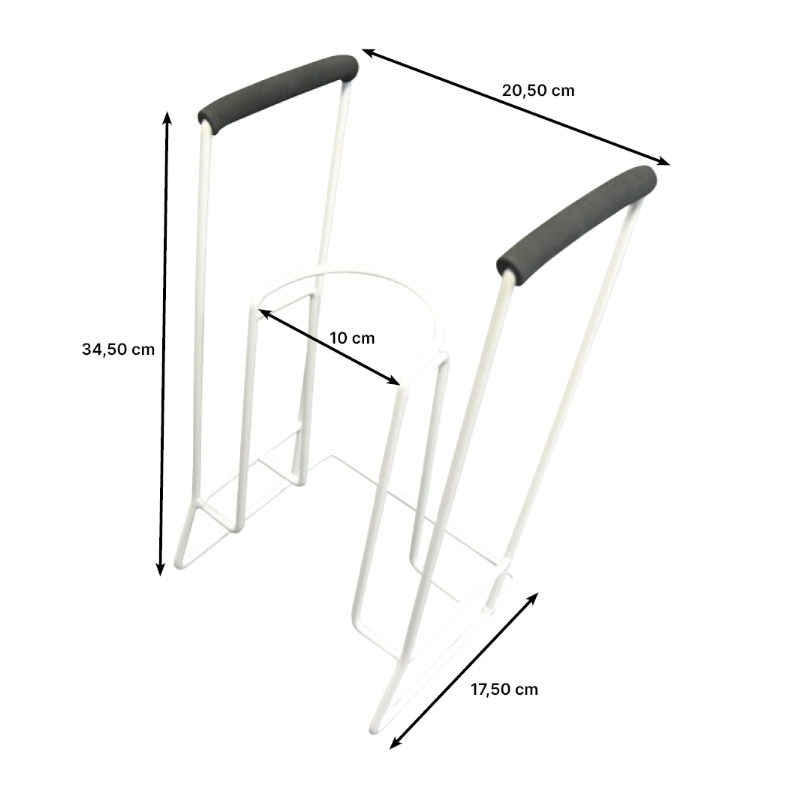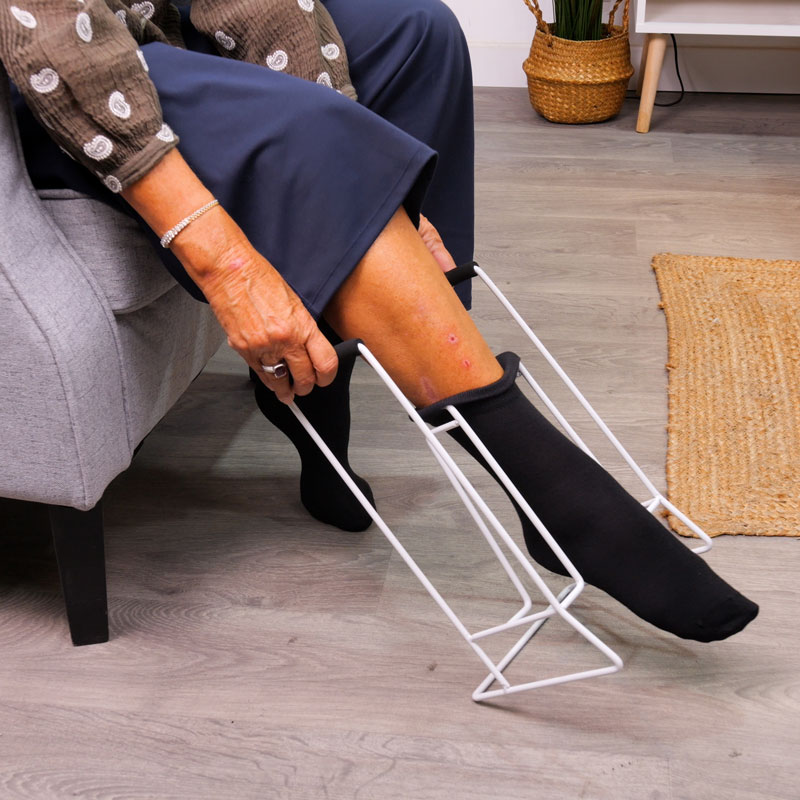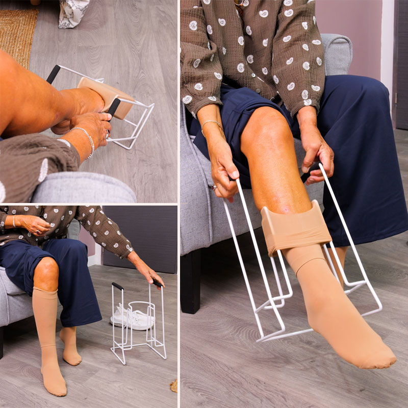 Notre enfile-bas Classic permet d’enfiler avec moins d’effort et de contorsions vos chaussettes ou bas de contention. Il suffit de l’enfiler d’abord sur le cadre métallique jusqu’au bout, d’insérer votre bout de pied et de tirer sur les poignées pour remonter l’ensemble le long de votre jambe. Cadre métallique peint époxy blanc. Dimensions : larg. 20,5 x prof. 17,5 x haut. 34,5 cm. Diamètre utile 10 cm.Poids 800 g