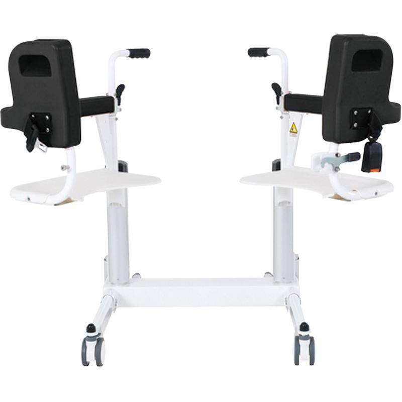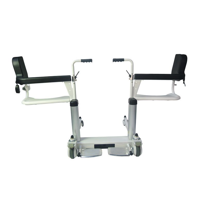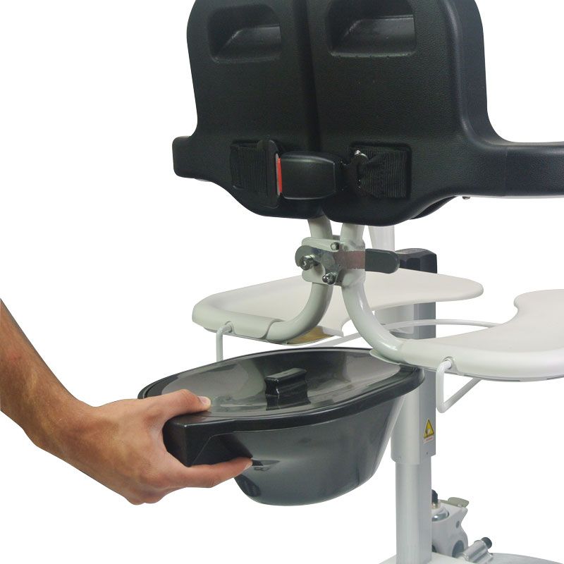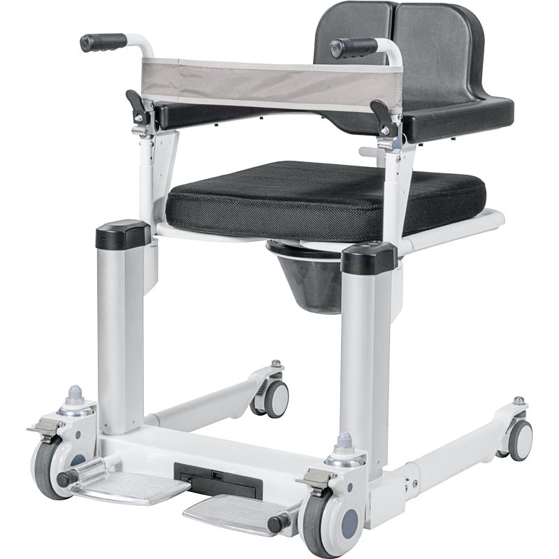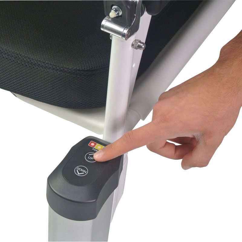 La version à élévation électrique du fauteuil Moovy.Comme le fauteuil Moovy standard, il vous permet de prendre en charge facilement, sans effort pour l’aidant et sans risque de douleurs pour le patient. Il vous permettra de transférer vos patients du lit à la douche ou aux toilettes.Il suffit de positionner l’assise du Moovy à la hauteur du fessier du patient, en modifiant la hauteur grâce aux vérins électriques. Commande montée/descente directement sur le Moovy (sans télécommande). Ensuite, il faut ouvrir l’assise, la refermer autour du patient et la sécuriser grâce à la double sécurité (taquet et boucle ceinture).Dispose de 4 roues à freins, d’une ceinture souple de sécurité et d’un dossier et d’accoudoirs en mousse souple.Il est livré avec un coussin de confort, et d’un pot amovible pour une utilisation autonome. Il dispose également de poignées repliables pour un meilleur accès au patient.Il peut être utilisé dans la douche de la salle de bain sous réserve de retirer la batterie avant utilisation. Merci de consulter la notice et de respecter les précautions d’emploi et instruction d’utilisation pour plus de renseignement. Dimensions hors-tout : larg. 62,5 x prof. 78 cm (sol) ou 82 cm (en haut).Dimensions assise : larg. 47 x prof. 43 x haut. 44,5 à 64 cm. Hauteur dossier 40,5 cm.Largeur entre accoudoirs 45,5 cm.Poids 35 kg.Poids maximum autorisé 150 kg