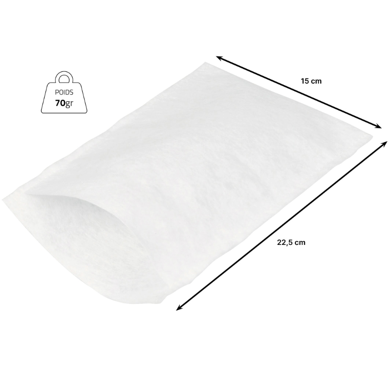 Usage unique. Molleton: polypropylène + polyester. Grammage 70g. Dimensions utiles : 15 x 22,5 cm. Coloris blanc. Sachet de 50.