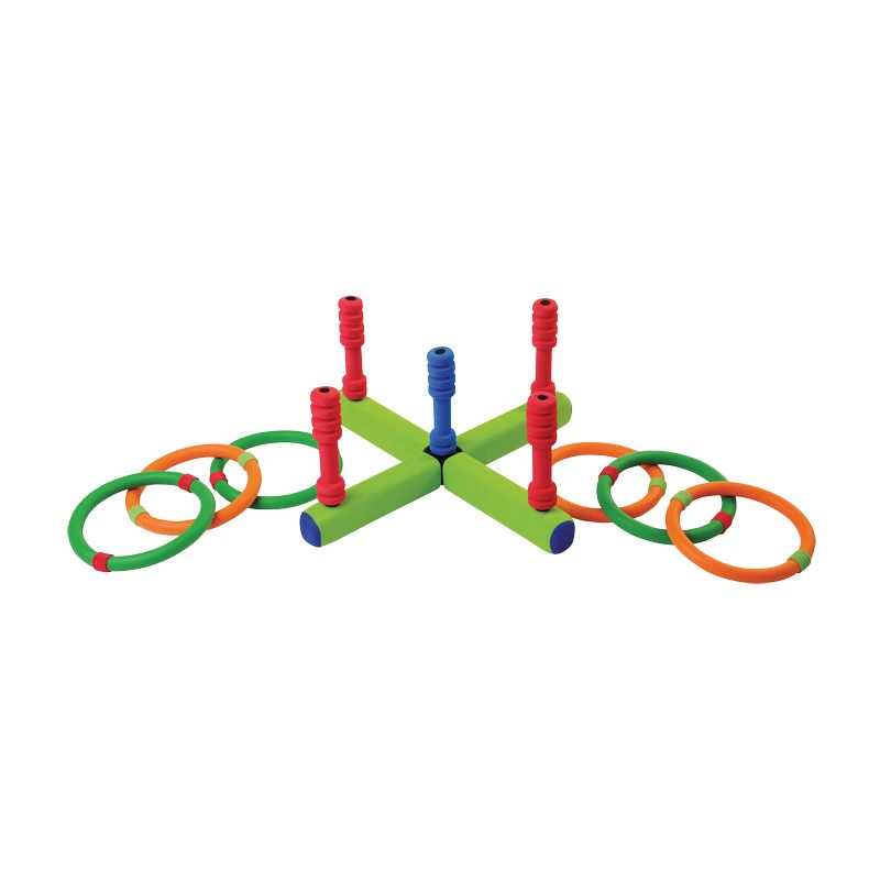 Idéal pour jouer sans bruit et en toute sécurité avec ce jeu d’anneaux en mousse. Ensemble très léger composé d’un socle 5 cibles et de 6 anneaux diam. 13,5 cm.