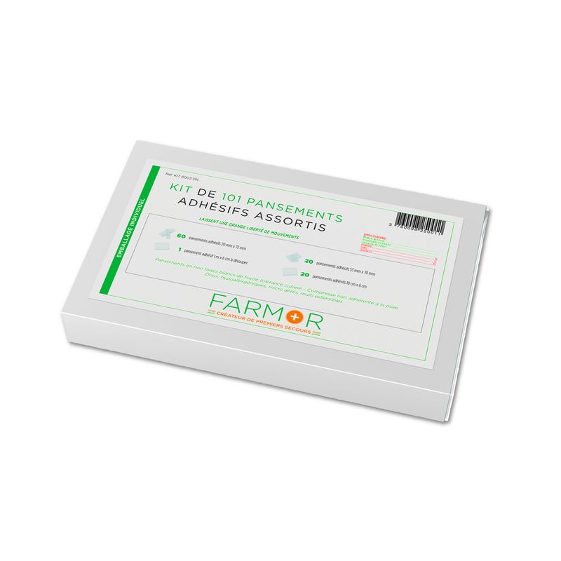 Pansements adhésifs en non tissé blanc de haute tolérance cutanée, doux et hypoallergéniques. Micro-aérés et multi-extensibles. Compresse non adhérente à la plaie. Contenance : 60 pansements adhésifs 20 mm x 72 mm, 20 pansements adhésifs 53 x 70 mm, 20 pansements 10 x 6 cm et 1 pansement 1 m x 6 cm. Emballage individuel.
