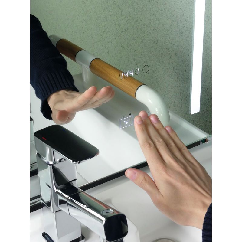 Cet ensemble permet aux personnes en fauteuil d’avoir une solution pour la toilette à hauteur. Grâce à la commande latérale 2 boutons, vous ajustez à loisir la hauteur du lavabo et de l’ensemble. L’ensemble est composé d’un lavabo de forme ergonomique, d’un large miroir éclairant, de 2 barres d’appui latérales pour un bon maintien et d’un robinet mitigeur en acier chromé. Bonde manoeuvrable à une main.Le miroir éclairant affiche l’heure et la température ambiante. Il s’éclaire avec 3 coloris différents avec une intensité réglable. L’allumage et les changements de couleurs se font en approchant simplement la main, sous toucher.Il dispose d’un cadre de fixation au mur pour davantage de sécurité. Livré avec flexibles d’arrivée d’eau et flexible d’évacuation d’eau.A brancher sur secteur (2 prises).Dimensions miroir : larg. 75 x haut. 80 cm. Dimensions lavabo : larg. 75 (interne 50) x prof. 55 (interne 40 cm) x haut. 71 à 91 cm. Hauteur des barres d’appui 79 à 99 cm.Dimensions du piètement : larg. 69 x prof. 62 cm. Profondeur hors-tout 62 cm.