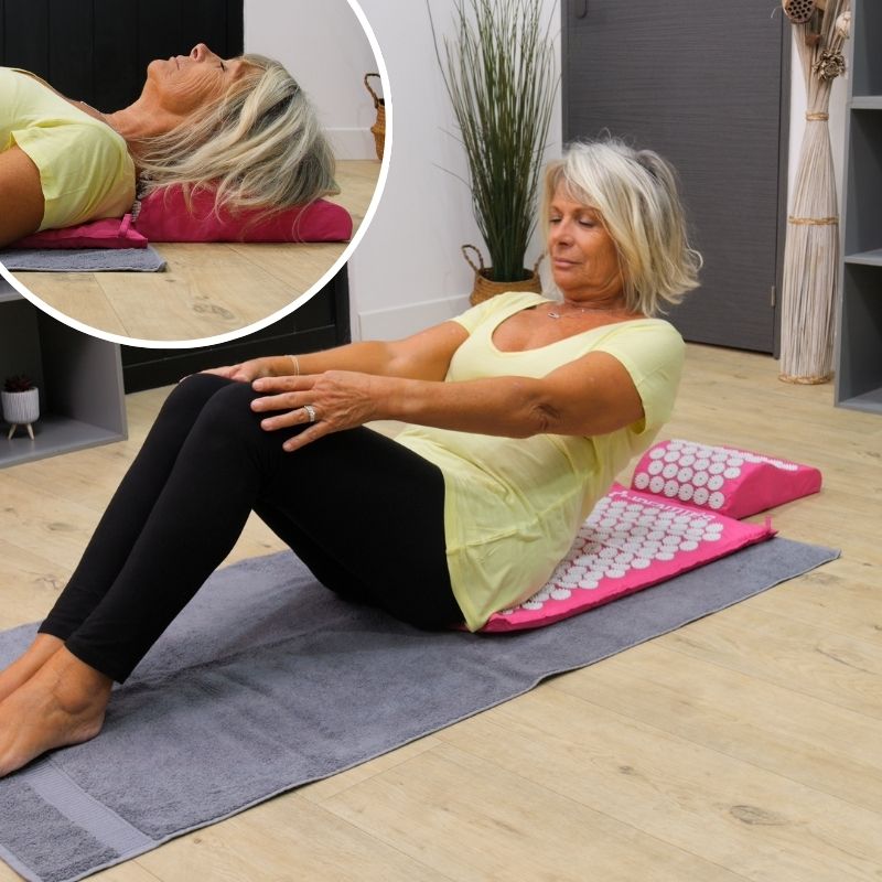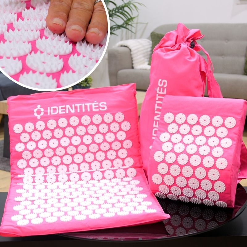 Matelas d’acupression :Allongez votre dos sur notre matelas tapissé de piquants et restez-y de 5 à 15 minutes, afin de déclencher la sécrétion d’endorphines et le soulagement des douleurs. Provoque une détente profonde des muscles du dos et de l’ensemble du système nerveux. Il est tapissé de milliers de pointes sans danger. Tapis matelassé. Mousse est en PU et la housse en coton. Les picots sont en ABS.Livré avec sac de rangement et de transport.Dimensions : 67 x 42 cm. Têtière :Mêmes bienfaits que le tapis mais en agissant sur la nuque et le cuir chevelu. Dimensions : 30 x 23 cm.Disponible en 2 coloris : blanc/fuchsia ou vert/anthracite.