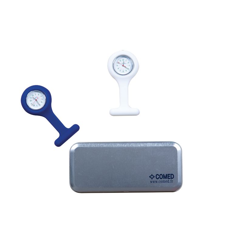 Montre avec entourage caoutchouc anti-choc. S’attache par une épingle de sûreté sur la poche. 5 modèles disponibles : blanc, bleu, motif zèbre, motif léopard et motif fleur.