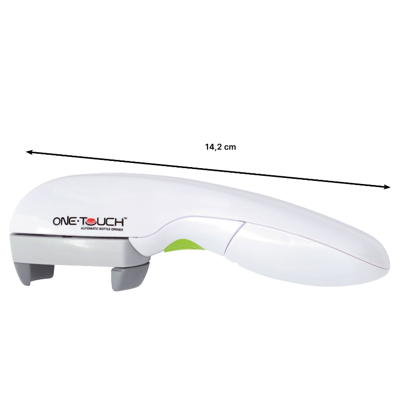 D’une simple pression, l’ouvre-bouteille automatique One Touch débouche tous les bouchons en plastique. Permet d’ouvrir vos bouteilles sans efforts, idéal pour les personnes avec des problèmes de préhension, les séniors et personnes dépendantes.Compatible avec les bouchons dévissables et/ou attachés.Ne revisse pas. Nécessite 2 piles AA non fournies. Long. 14,2 cm.
