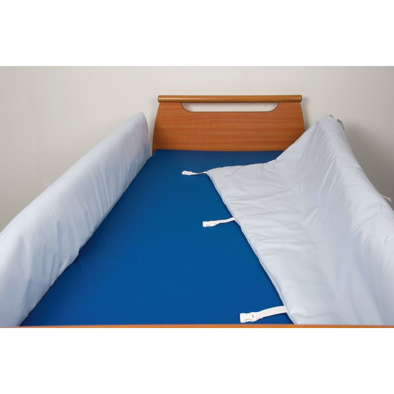 Cette protection capitonnée se place sur les barrières de lit médicalisé pour protéger les patients pendant la nuit. Elle permet de sécuriser les utilisateurs en comblant les espaces entre les barres. Housse bactériostatique classée non-feu M1 lavable à 90°, respirante et désinfectable. 3 modèles disponibles : – Protection simple avec un côté capitonné s’attachant par 3 sangles et boucles du côté extérieur. Garnissage mousse. Dimensions : Long. 130 x haut. 35 x épaisseur 2 cm. Coloris bleu clair.- Protection double qui entoure les 2 côtés de la barrière et se fixant par 4 boucles. Grande longueur. Garnissage fibre polyester spiralée. Dimensions : Long. 185 x larg. 72 x épaisseur 4 cm. Coloris bleu clair.- Protection pour tête de lit : dimensions : 90 x 35 x 2 cm.Fabrication 100% française.