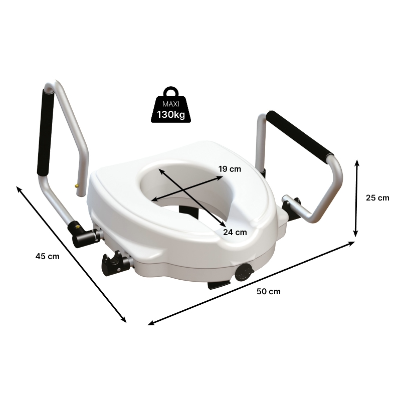 Notre rehausse Primo dispose de 2 accoudoirs relevables. Relevés, ils vous permettent de réaliser un transfert latéral facilement, et en position basse, ils vous permettent d’y prendre appui pour vous redresser des toilettes. La rehausse a une forme anatomique et une inclinaison vers l’avant pour votre confort. Elle se fixe fermement grâce à ses pattes de fixations arrières et son mécanisme de serrage à l’avant. Polyethylène haute densité et aluminium. Rehausse votre cuvette de 12,5 cm.Dimensions hors tout : larg. 50 x prof. 45 x haut. 25 cmEvidement central : larg. 19 cm x prof. 24 cmPoids maxi supporté : 130 kg