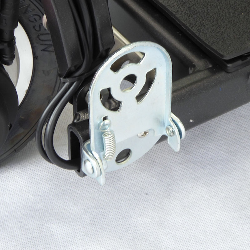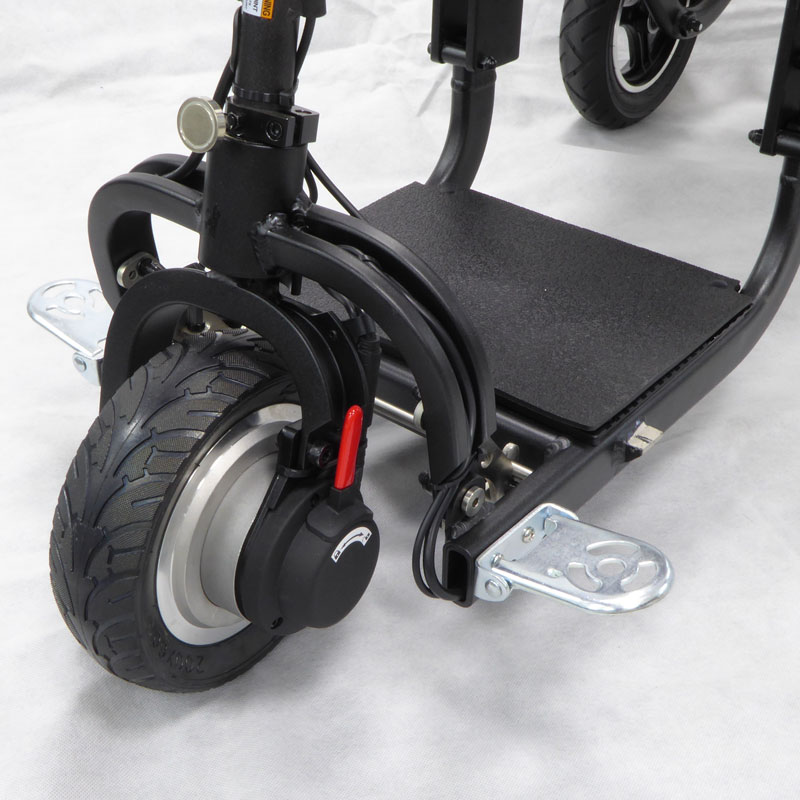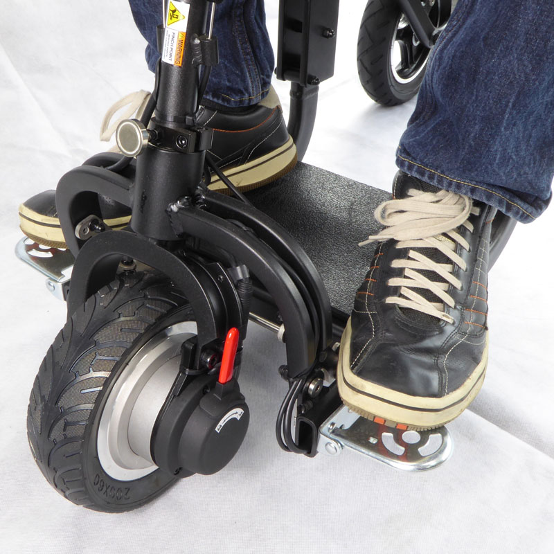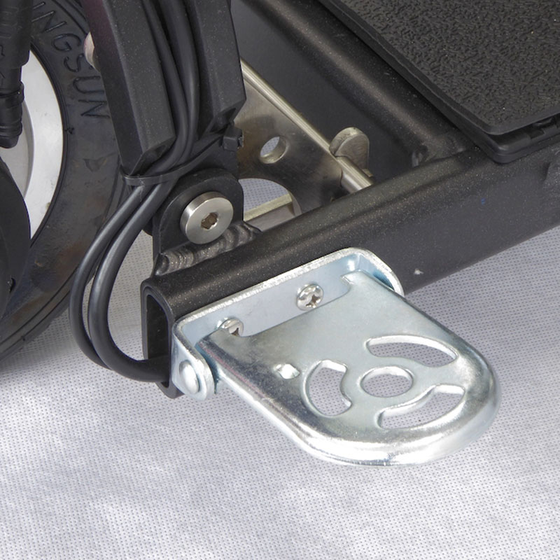 Le repose-pieds permet d’augmenter l’allonge d’assise.Il se rabat complètement contre le scooter pour le ranger et minimiser son espace.
