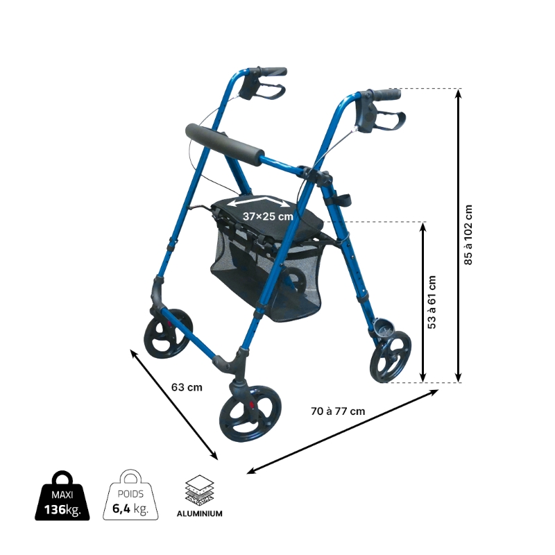 Notre rollator Neo Fashion allie fonctionnalité et modernité grâce à sa peinture pailletée au coloris vif. Ce déambulateur dispose d’un dossier confortable et relevable en hauteur pour le pliage. L’assise est recouverte d’une housse confort mousse + mesh. Livré avec sac de course amovible. Roues souples et non marquantes de 20 cm. Nouveau système de freinage plus sûr. Maintenant livré avec porte-canne. Petite largeur hors-tout. Assise réglable en hauteur.Dimensions hors-tout : larg. 63 x prof. 70 à 77 x haut. 85 à 102 cm en 5 positions (par rapport à l’assise 31 à 40 cm).Dimensions assise : larg. 37 x prof. 25 x haut. 53 à 61 cm. Largeur entre poignées : 45 cm.Poids 6,4 kg.Poids maximum supporté 136 kg