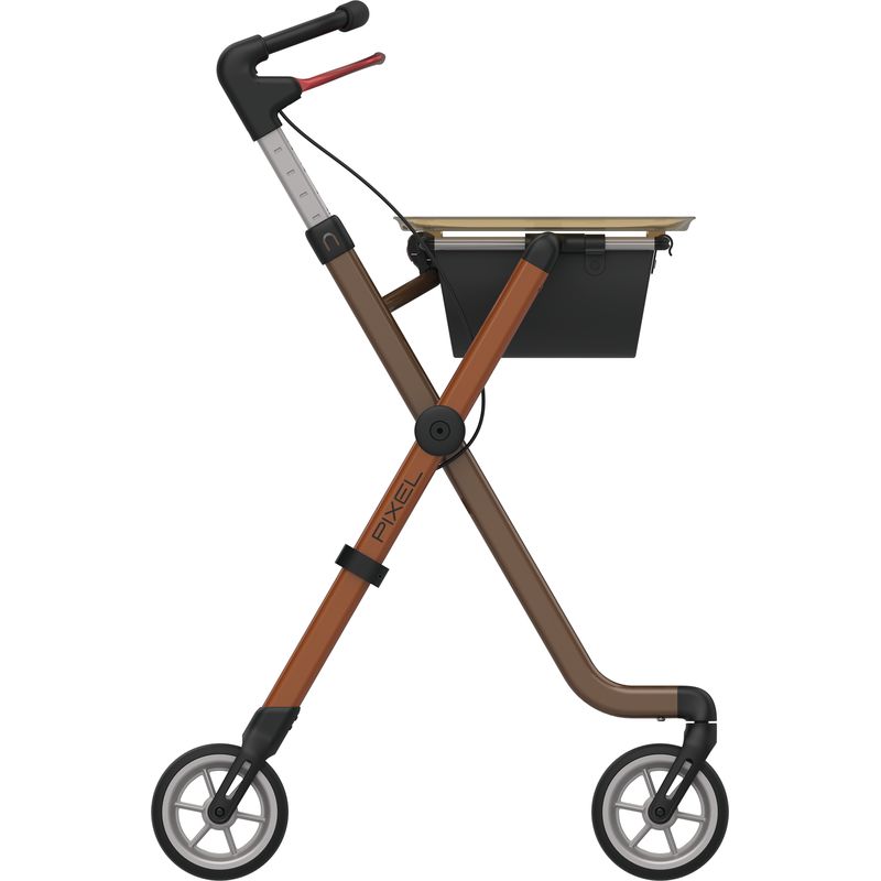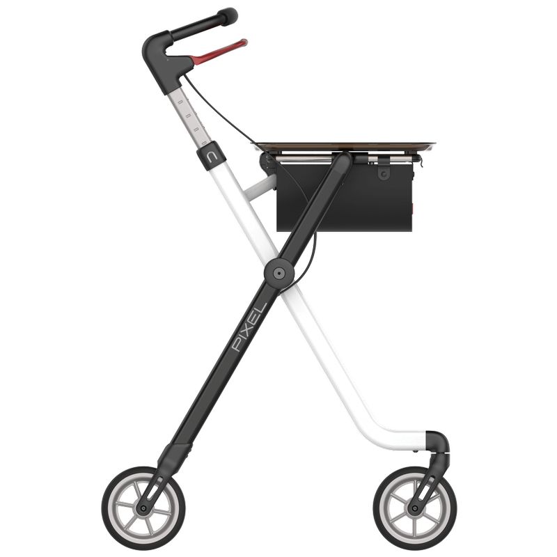 Structure très résistante et rigide. Roues en matériau souple et freins très efficaces, même sur des surfaces mouillées. Conception de la fourche permettant la non-accumulation de poussières et boues.Livré avec plateau pour une utilisation intérieure.Dimensions : larg. 54 x prof. 65 (plié 26 cm) x haut. 86 à 98 cm. Haut. plateau 71 cm.Poids 5,2 kg.2 coloris au choix : blanc ou caramel.