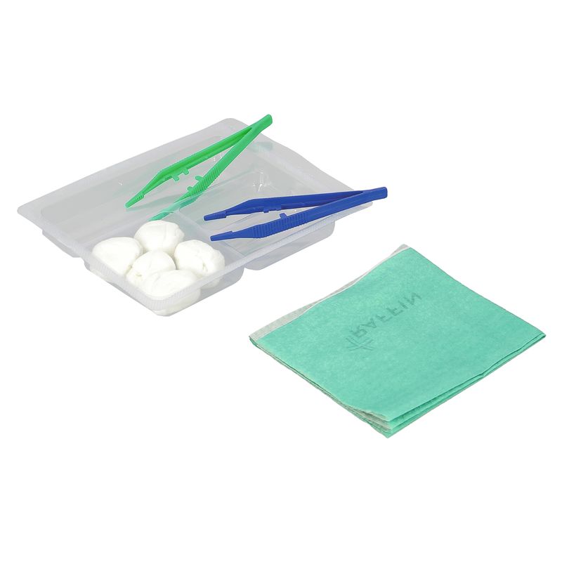 Set Blister 4 compartiments 15x20cm composé de 1 Champ en cellulose/PE 30x48cm, 5 tampons en non tissé 3cm 30g et de 2 Pinces anatomiques en plastique double denture 12.5cm. Colisage par carton : 56 pansements.