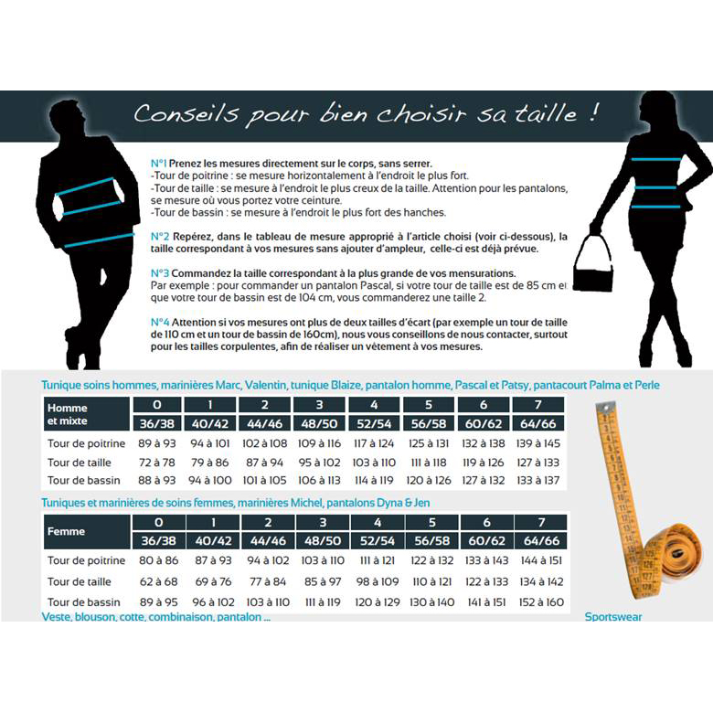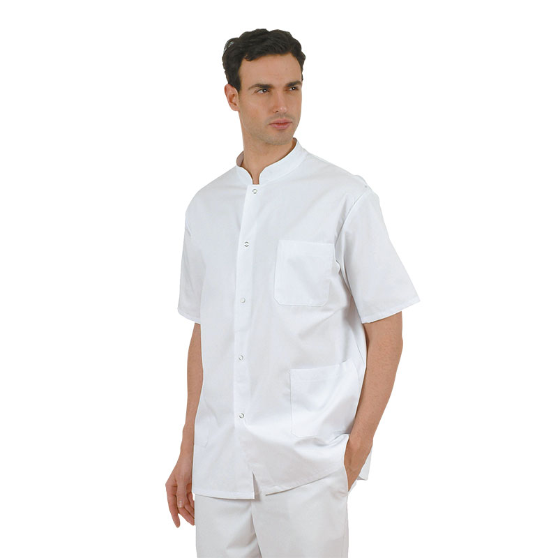 Col officier. Fermeture centrale 5 pressions. Manches courtes montées. 3 poches. Haut. 80 cm. Sergé uni blanc 65 % polyester 35 % coton. 210 g/m2. Lavage 85°.4 tailles disponibles : 40/42 ; 44/46 ; 48/50 ; 52/54