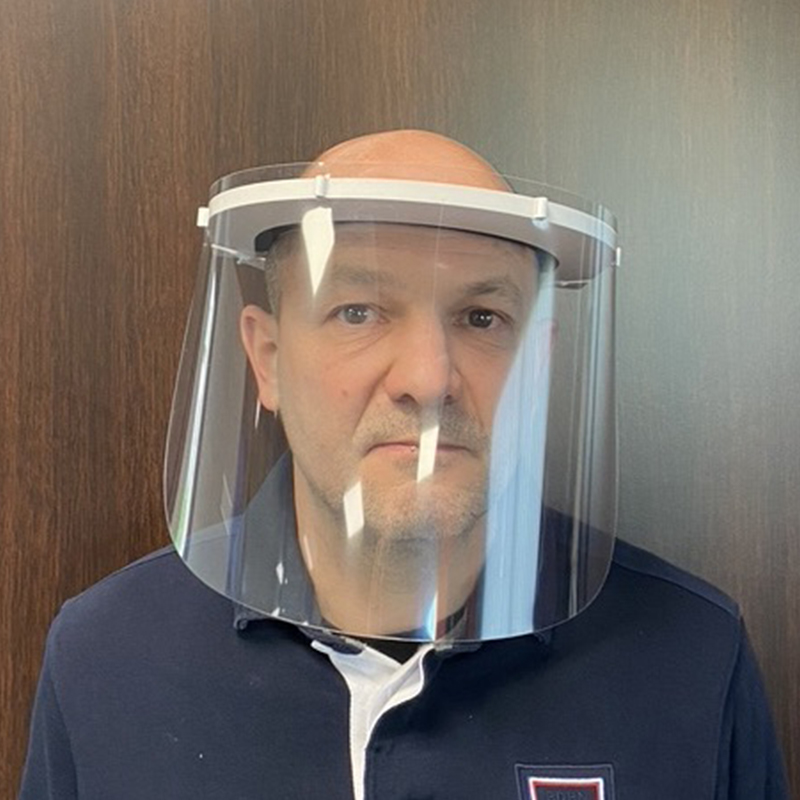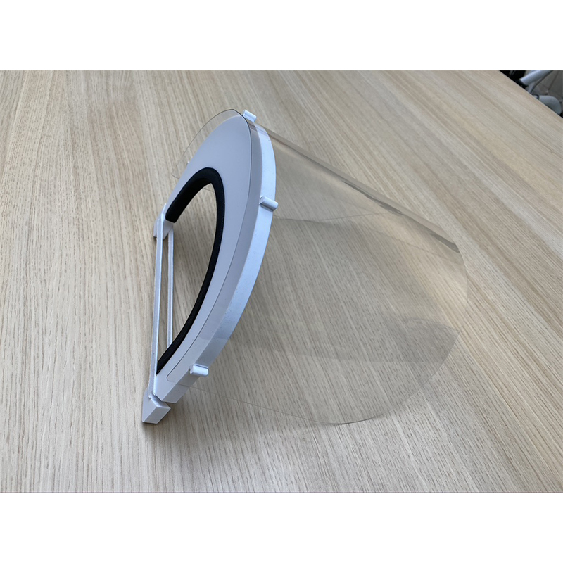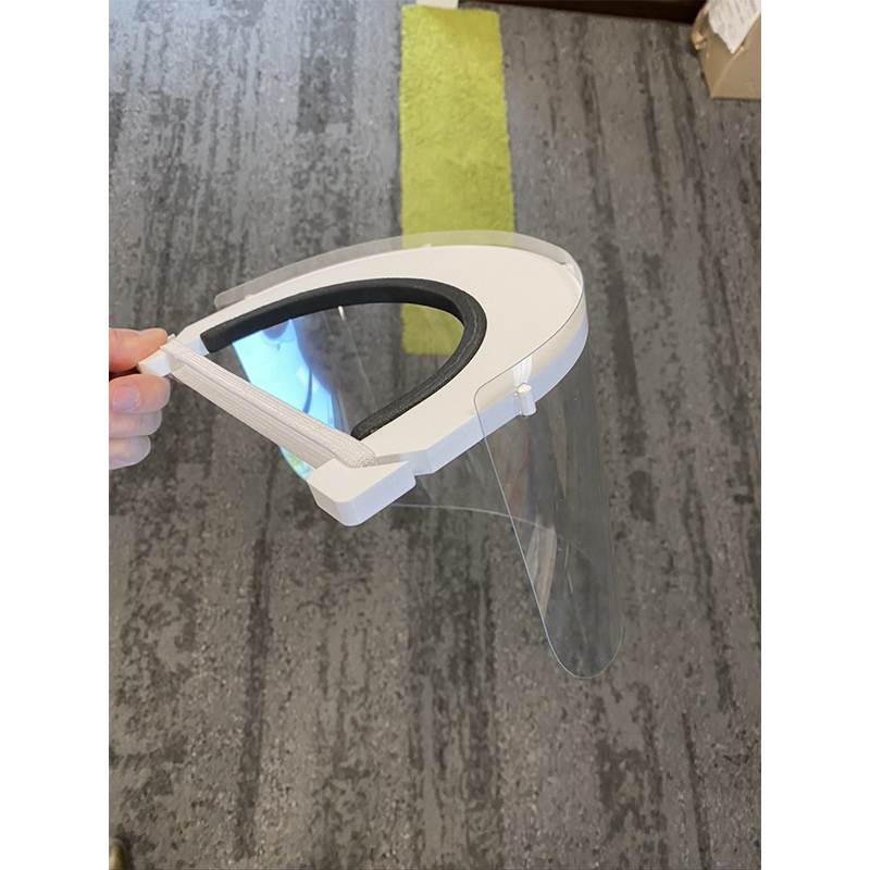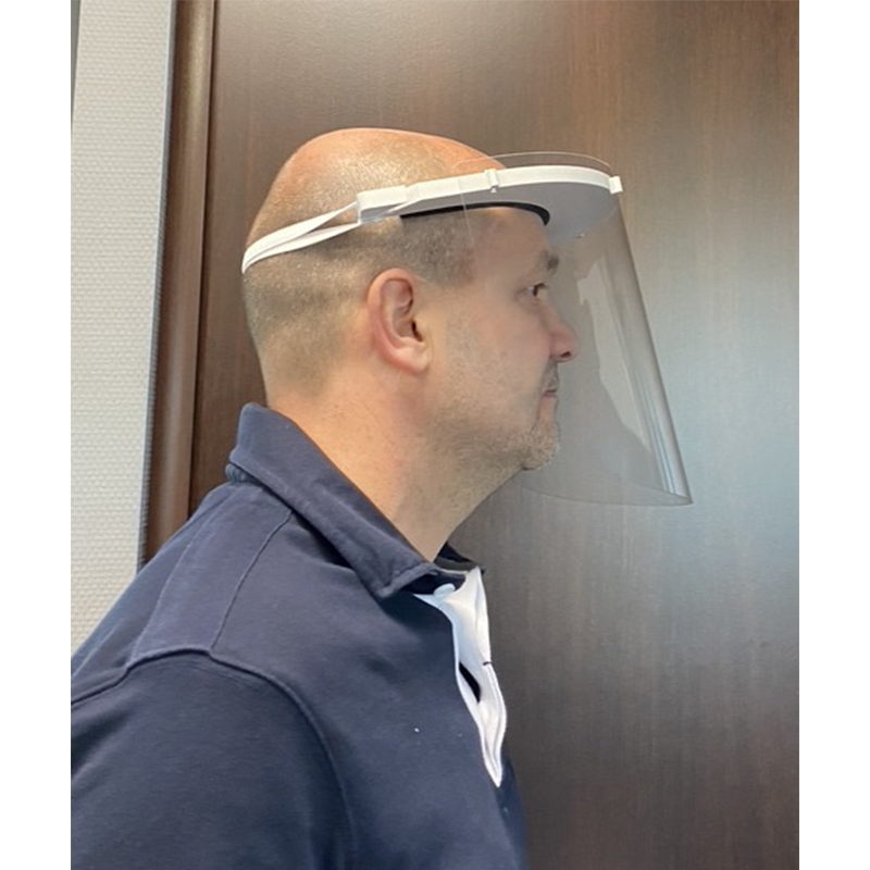 Visière de protection soignant, élastique pour fixation sur la tête.Séparation entre front et visière 45 mm.Matériau : polystyrène, mousse et PVC transparentDimensions : hauteur 215 mm x largeur 220 mm